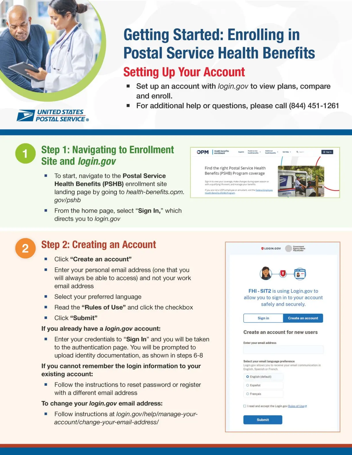 Experiencing issues with login.gov? Try Form 2809! Postal Service Health Benefits program enrollment can be facilitated by completing form SF2809, Health Benefits Election Form, accessible on the OPM website and MyHR.USPS.gov. If more assistance is needed, click here.